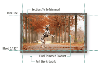 The bleed is the extra area on your file past the approximate trim line to accommodate any design element that extends or "bleeds" to the edge of the final product.This ensures that there’s no white lines on the edges of your file once printed and cut. At PrintsWell, we require designs to have a 0.125” bleed on each side of your print file to make sure everything comes out perfectly. Bleeds are not necessary when all artwork or printing stays at least 0.125 away from the trim line. Even if your design doesn’t require bleed, including the bleed area on all files is a simple and reliable rule of thumb. It helps prevent issues if your design changes later.